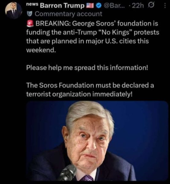 «Το ίδρυμα του Τζορτζ Σόρος χρηματοδοτεί τις διαδηλώσεις ‘Χωρίς Βασιλιάδες’ σε μεγάλες αμερικανικές πόλεις αυτό το Σαββατοκύριακο. Παρακαλώ βοηθήστε να διαδοθούν αυτές οι πληροφορίες! Το Ίδρυμα Σόρος πρέπει να κηρυχθεί άμεσα τρομοκρατική οργάνωση!»