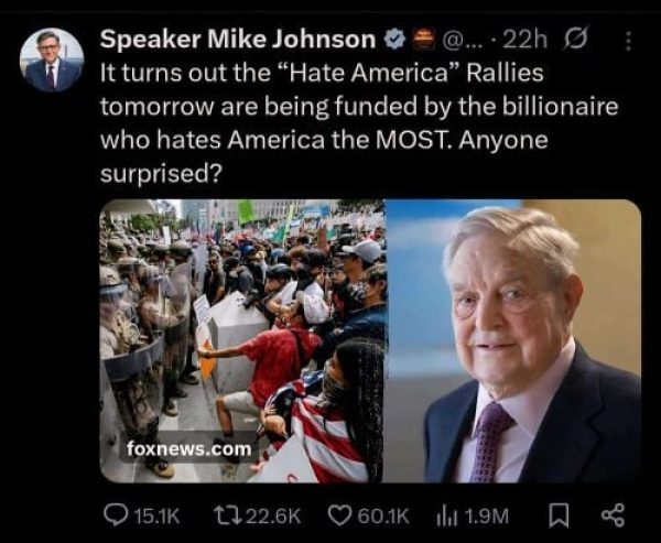 Η πρώτη αντίδραση ήρθε από τον Πρόεδρο της Βουλής, Μάικ Τζόνσον, ο οποίος με ανάρτησή του στο X επιτέθηκε στον Σόρος, δημοσιεύοντας και τη φωτογραφία του. Όπως ανέφερε: