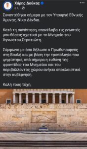 Ο κ. Δούκας συζήτησε με τον κ. Δένδια και το θέμα του αγνώστου στρατιώτη και επανέλαβε τη θέση του .