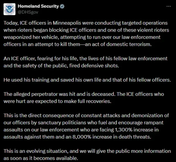 Η υπουργός Εσωτερικής Ασφαλείας Κρίστι Νόεμ, από την πλευρά της, υιοθέτησε σκληρή ρητορική, χαρακτηρίζοντας τις ενέργειες της γυναίκας «εγχώρια τρομοκρατία» και δηλώνοντας ότι ο πράκτορας ενήργησε για να προστατεύσει τη ζωή του. Παράλληλα, επιβεβαίωσε ότι πάνω από 2.000 ομοσπονδιακοί πράκτορες έχουν αναπτυχθεί στη Μινεάπολη, στο πλαίσιο μιας από τις μεγαλύτερες επιχειρήσεις του υπουργείου Εσωτερικής Ασφάλειας των τελευταίων ετών.