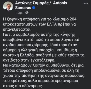 Με ανακοίνωση του στα social media ο πρώην Πρωθυπουργός κ. Αντώνης Σαμαράς αναφέρεται κατά της κυβερνητικής απόφασης Για το κλείσιμο των 204 καταστημάτων ΕΛΤΑ .