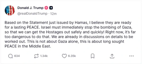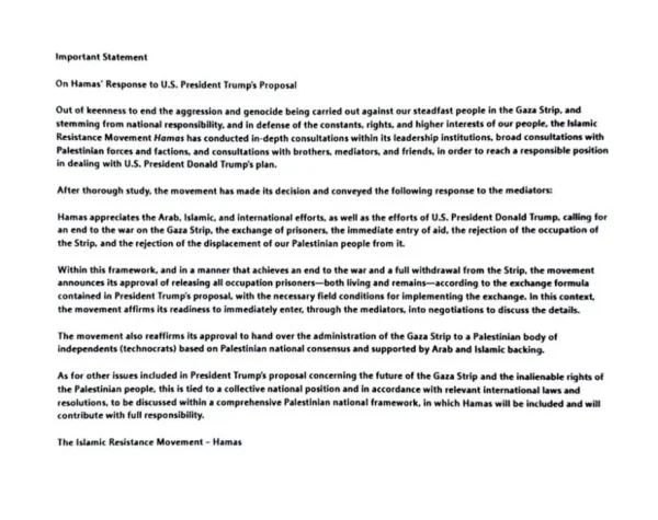 Σε δήλωσή της μέσω Telegram, η παλαιστινιακή οργάνωση ανακοίνωσε ότι αποδέχεται την πρόταση Τραμπ για παύση των εχθροπραξιών και είναι διατεθειμένη να απελευθερώσει όλους τους ομήρους με αντάλλαγμα τη διασφάλιση μόνιμης εκεχειρίας. Παράλληλα, δήλωσε πρόθυμη να παραδώσει τη διοίκηση της Λωρίδας της Γάζας σε παλαιστινιακό σχήμα ανεξάρτητων προσωπικοτήτων, χωρίς κομματικές δεσμεύσεις.