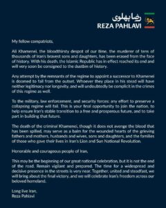 Προς τον στρατό, την επιβολή του νόμου και τις δυνάμεις ασφαλείας: κάθε προσπάθεια διατήρησης ενός καθεστώτος που πέφτει είναι καταδικασμένη σε αποτυχία. Αυτή είναι η τελευταία σας ευκαιρία να ενταχθείτε στο έθνος, να βοηθήσετε στη σταθεροποίηση του Ιράν σε ένα ελεύθερο και ευημερούμενο μέλλον και να λάβετε μέρος στην οικοδόμηση