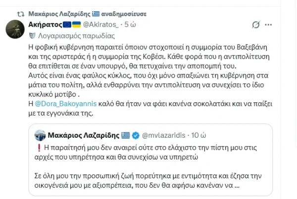 Μετά την παρέμβαση της Ντόρας Μπακογιάννη στο MEGA που παρότρυνε τον κ. Λαζαρίδη να παραιτηθεί για να διευκολύνει την κυβέρνηση ο παραιτηθείς υφυπουργός πέρασε στην αντεπίθεση αναδημοσιεύοντας την ανάρτηση ενός ανώνυμου χρήστη στο Χ (πρώην Twitter) με το όνομα «Ακήρατος».