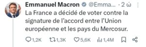 Λίγα 24ωρα πριν την υπογραφή της εμπορικής συμφωνίας της Ευρωπαϊκής Ένωσης με τη Λατινική Αμερική την γνωστή σε όλους μας mercosur, ο Γάλλος πρόεδρος Emanuel Macron ταράζει τα νερά και ανακοινώνει ότι δεν πρόκειται να ψηφίσει η Γαλλία την επικείμενη συμφωνία.